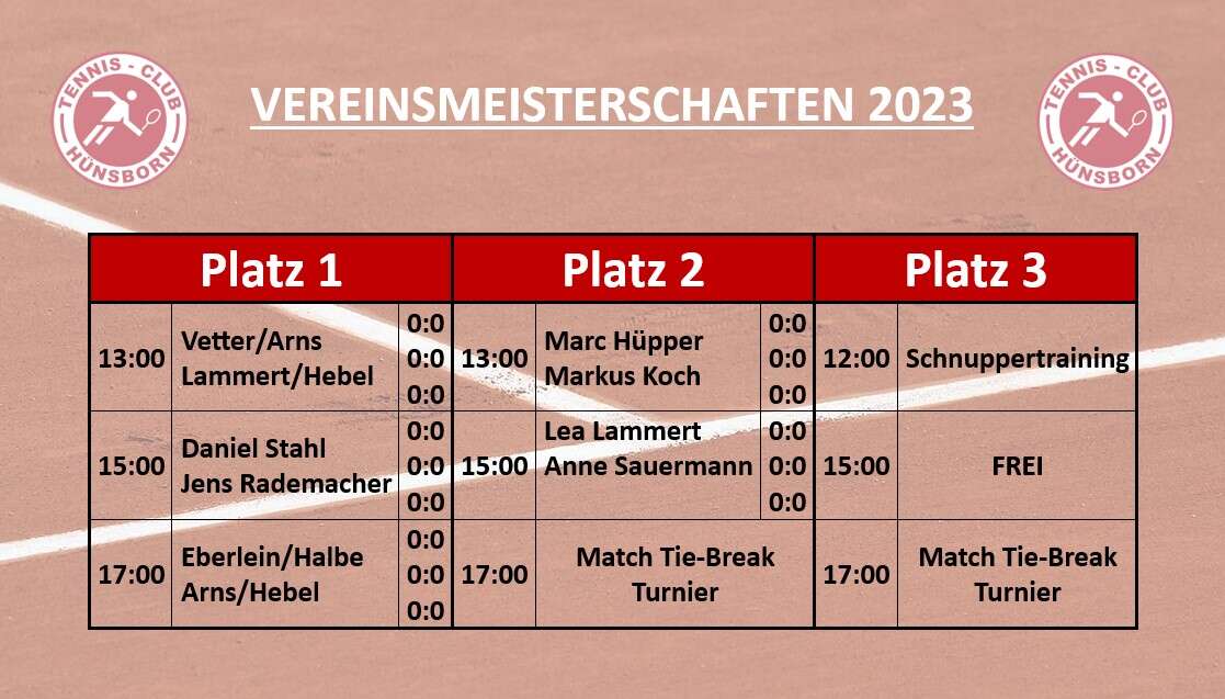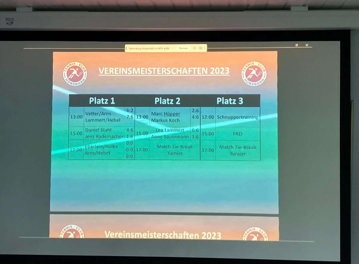 In der Vereinsmeisterschaft wurde zweimal gespielt. Im Damen-Doppel konnten die Titelverteidiger Böcking & Wurm gegen Menn & Lammert mit 7:5 und 6:4 gewinnen und feiern somit ihren ersten Sieg in der Gruppenphase. Bei den Herren A besiegte Marc Hüpper Dominik Klur mit 6:1 und 6:2 und trifft nun auf den Titelverteidiger Fabian Knott.